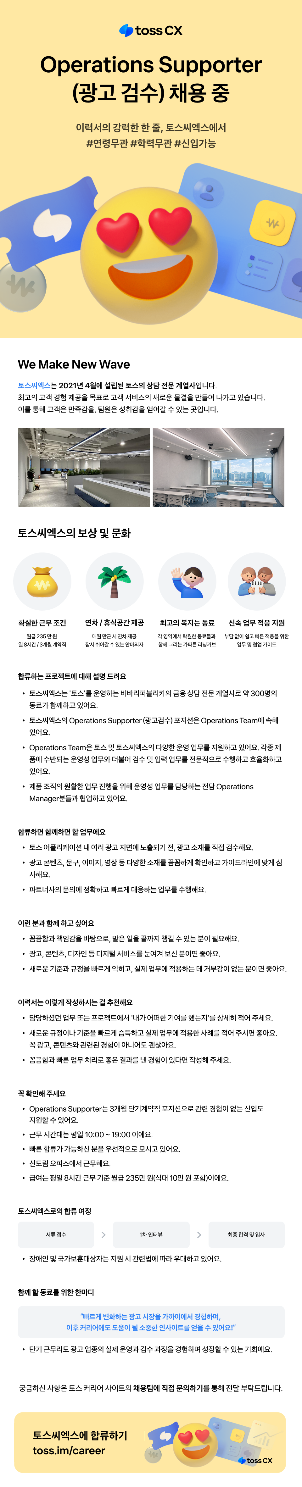 [토스씨엑스] Operations Supporter (광고검수) 모집 (~5/5)